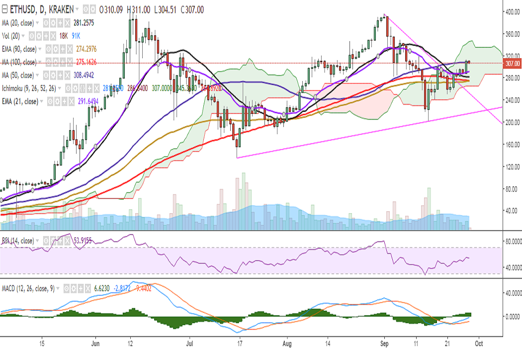 ETH/USD has broken above 300 levels and is hovering around 50-DMA at 309 levels at the time of writing (Kraken).