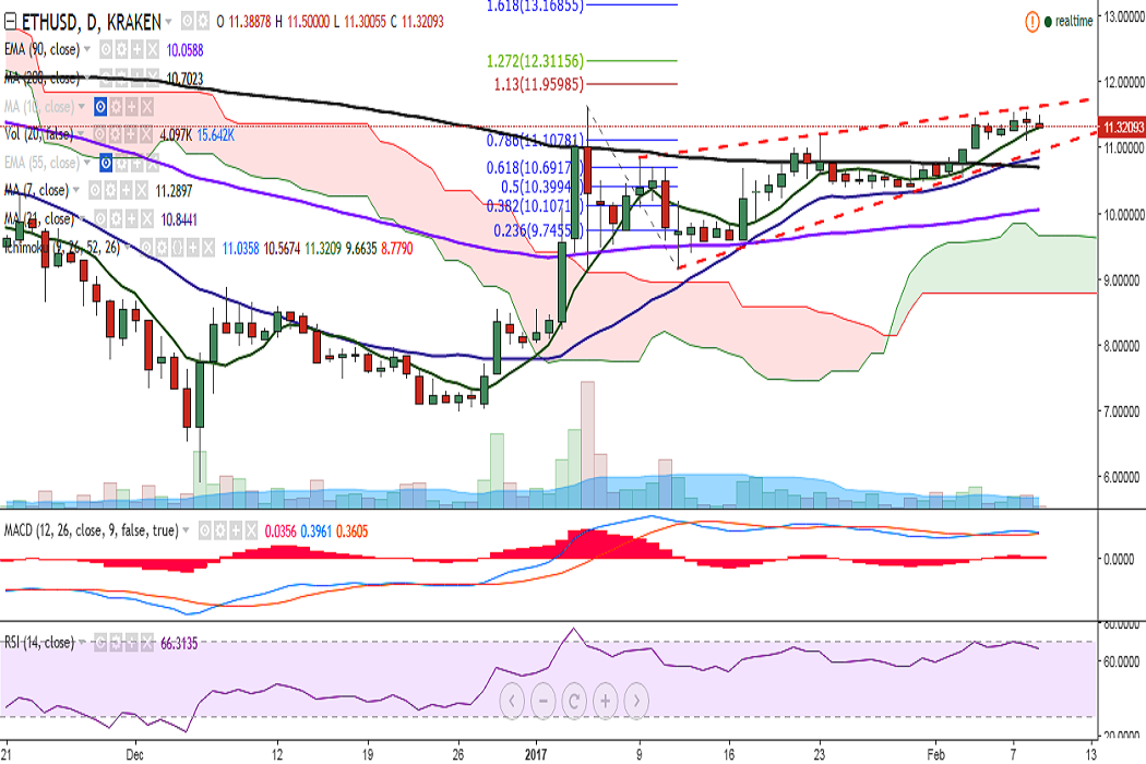 ETH/USD continued trading in the red on Thursday and is currently hovering around 7-DMA at the time of writing. It is trading at 11.32 levels at press time (Kraken).