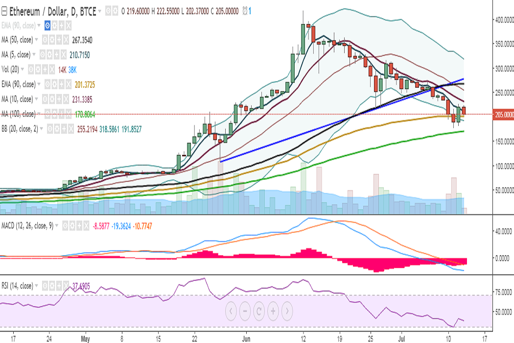ETH/USD broke above 5-DMA on Wednesday, but could not hold its strength and is trading in the red today. It is currently trading at 205 levels at the time of writing (BTC-e).