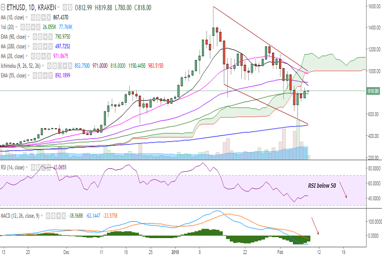 ETH/USD is trading in a close range on Friday and hovering around 800 levels at the time of writing (Kraken).