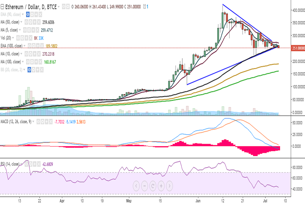 ETH/USD broke below major support at 50-DMA on Friday and is currently trading at 251 levels at the time of writing (BTC-e).