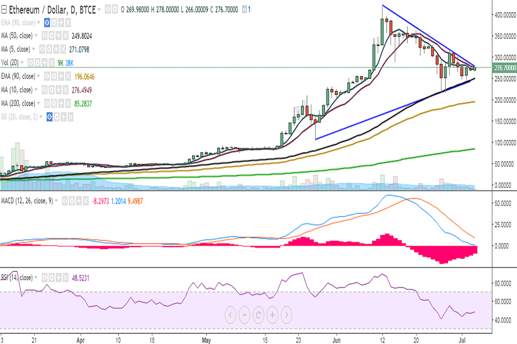 ETH/USD is struggling for a consitent break above the major trend line resistance joining 417 and 315. It is currently trading at 276 levels at the time of writing (BTC-e).