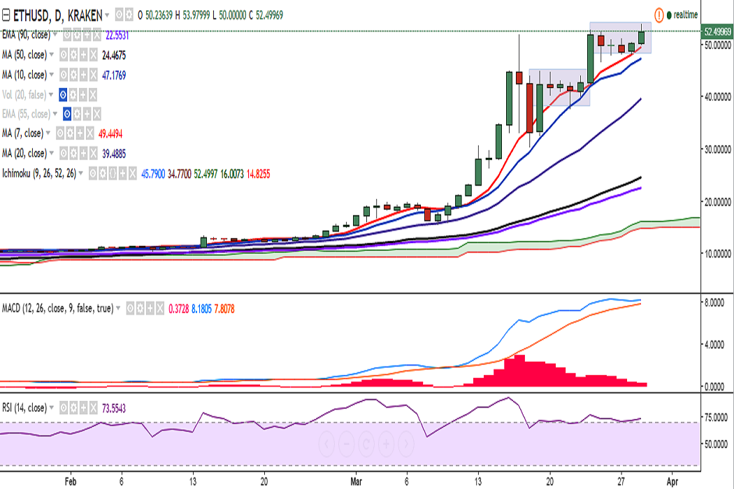 ETH/USD hit a fresh high of 53.97 on Wednesday and is currently at 52 levels at the time of writing (Kraken).