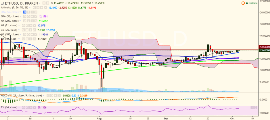 ETH/USD has hit 13.47 levels so far in the day and looking to break above the previous high of 13.50 levels (Kraken).