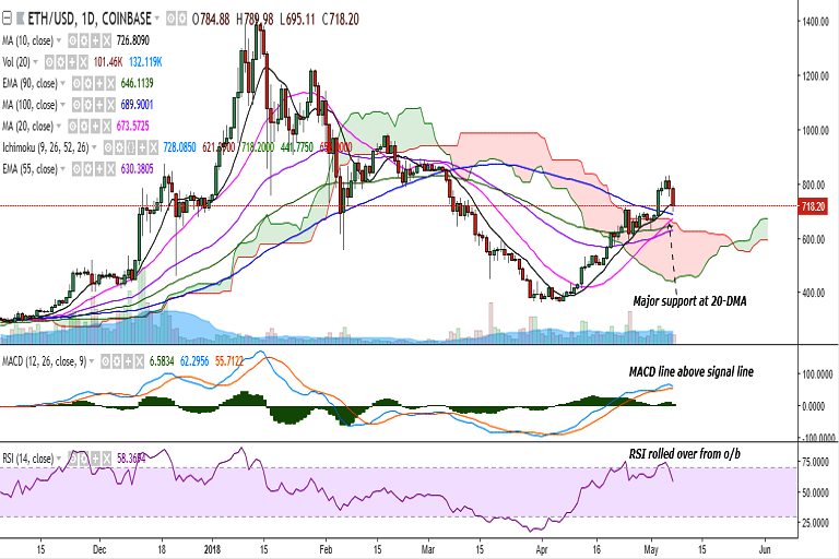 ETH/USD is trading deep in the red on Monday as it failed to close above 1w 20-SMA. It is currently trading at 717 levels at the time of writing (Coinbase).
