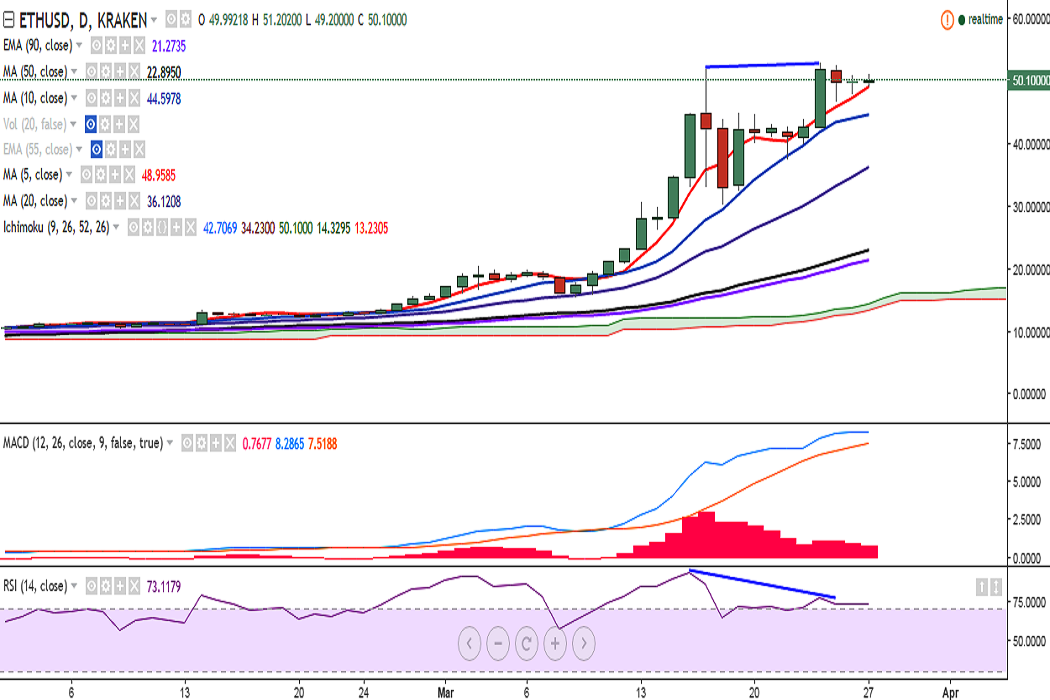 ETH/USD broke above the previous high of 51.90 levels and hit 52.89 levels on March 24. It is currently trading at 50 levels at the time of writing (Kraken).