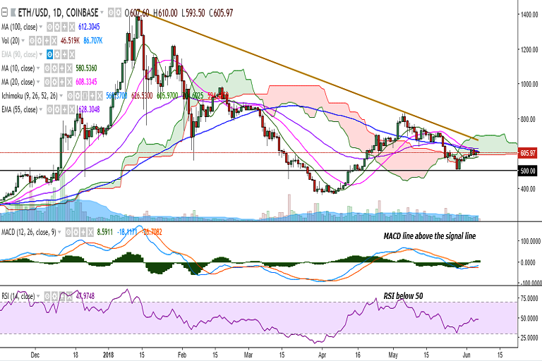 ETH/USD is extremely rangebound on Wednesday with its upside capped by 100-DMA. It is currently trading at 605 levels (Coinbase).
