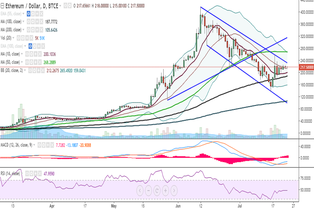 ETH/USD is trading in an extremely narrow range from past couple of sessions. It is currently trading at 217 levels at the time of writing (BTC-e).
