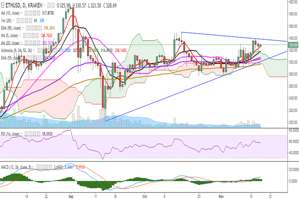 ETH/USD is trading in a narrow range on Friday and hovering around 5-DMA at 326 levels at the time of writing (Kraken).