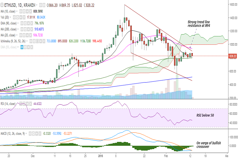 ETH/USD continues to trade in a narrow range on Tuesday as it faces strong trend line resistance at 894 levels. It is currently trading at 832 levels at the time of writing (Kraken).