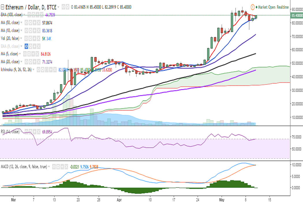 ETH/USD is trading in a narrow range between 82 and 86 levels as its upside is being capped by 5-DMA. It is currently trading at 85 levels at the time of writing (BTC-e).