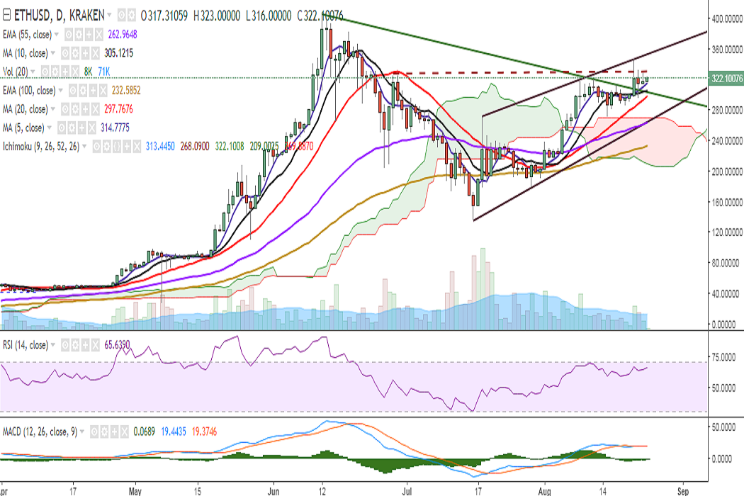 ETH/USD is continuing rangebound trade on Thursday as it struggles for a decisive break above 325 levels. It is currently trading at 322 levels at the time of writing (Kraken).