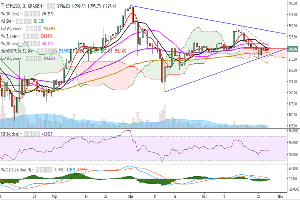 ETH/USD continues trading in a close range on Friday as it faces strong trend line resistance at 300 levels. It is currently trading at 297 levels at the time of writing (Bitstamp).