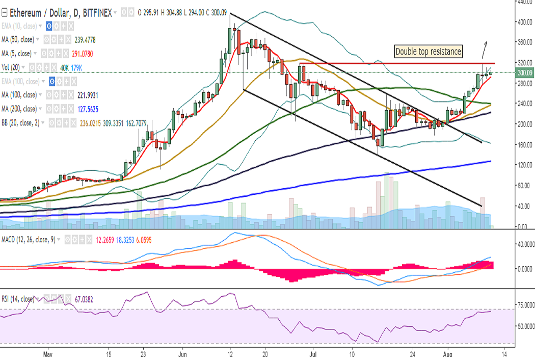 ETH/USD continues to hover around 300 levels on Friday as it faces strong double top resistance at 318 levels (Bitfinex).