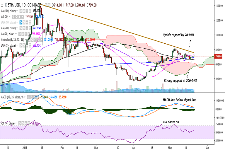 ETH/USD is trading in a narrow range on Monday with its upside capped by 20-DMA. It is currently trading at 707 levels at press time (Coinbase).