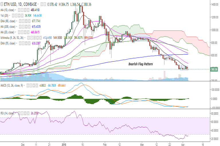 ETH/USD is continuing its rangebound trading on Thursday with its upside capped by 10-DMA. It is currently trading at 379 levels at the time of writing (Coinbase).