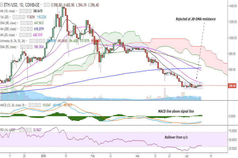 ETH/USD is trading in a narrow range on Tuesday after it was rejected at 20-DMA. It is currently trading at 396 at the time of writing (Coinbase).