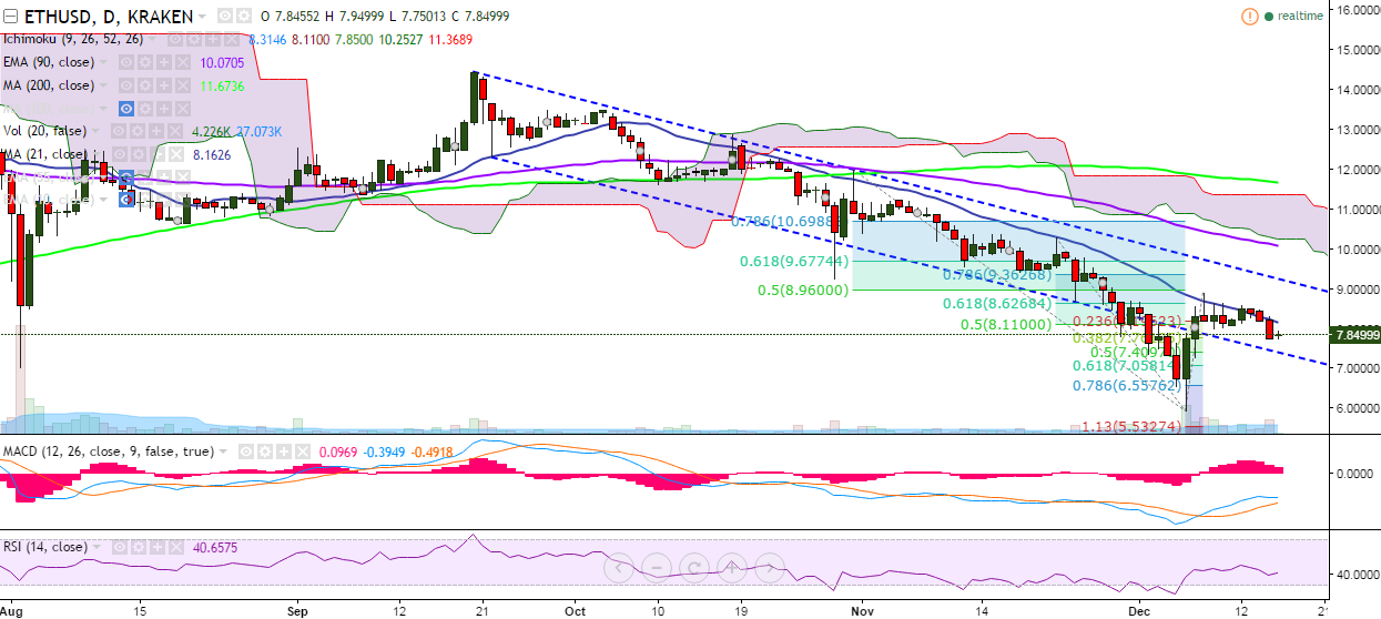 ETH/USD fell to 7.72 levels on Thursday and is currently trading at 7.83 levels, well below 21-day MA, the time of writing (Kraken).