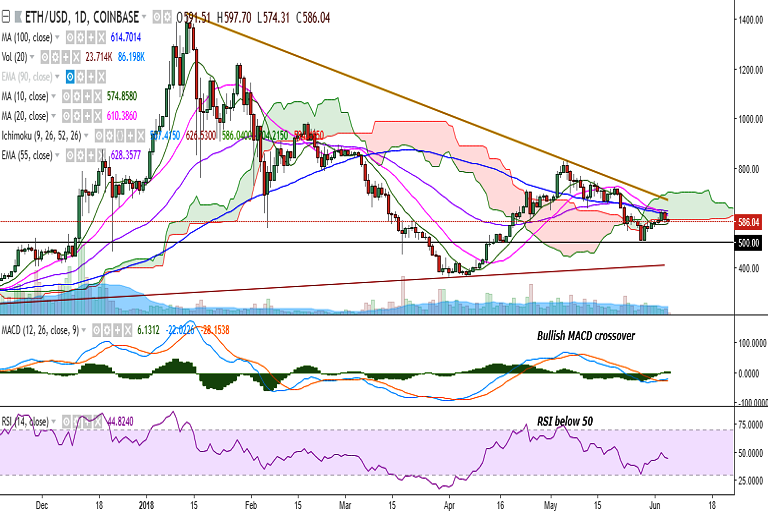 ETH/USD failed to break above 55-EMA and is currently trading at 586 levels at the time of writing (Coinbase).