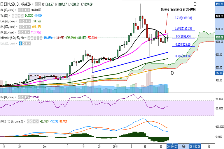 ETH/USD surged to 1107 levels earlier in the day but failed to hold it strength. It is currently trading at 1070 levels at the time of writing (Kraken).