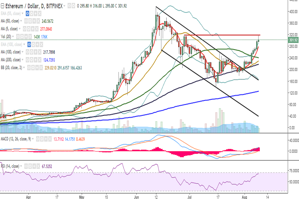 ETH/USD traded higher and broke above the 300 mark on Wednesday. It has hit 316 levels so far in the day and is currently trading at 303 levels at the time of writing (Bitfinex).