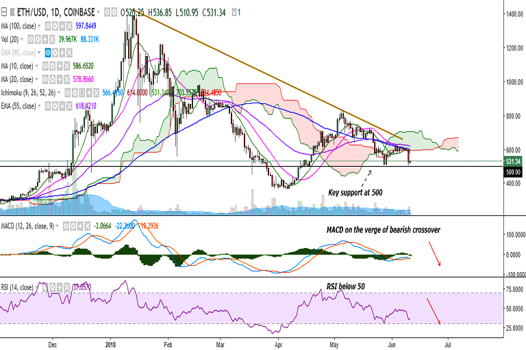 ETH/USD stopped short of 500 levels as the cryptocurrency market slumped after the news on Coinrail hack broke. It is currently trading at 532 levels at the time of writing (Coinbase).