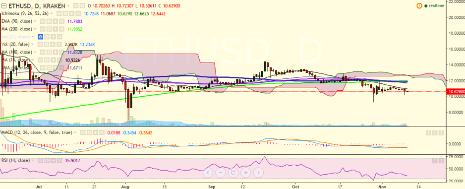 ETH/USD hit a low of 10.22 levels on Wednesday and is currently trading slightly above at 10.62 levels at the time of writing (Kraken).