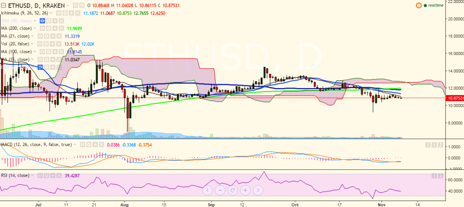 ETH/USD is facing strong resistance at 11.10 (15-day MA) and is struggling for a consistent break above this level. It is currently trading at 10.87 levels (Kraken).