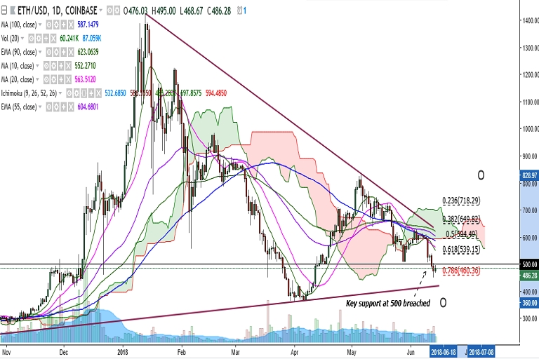 ETH/USD dropped to 450 levels on Wednesday before closing at 476 levels. It is currently trading at 486 levels at the time of writing (Coinbase).