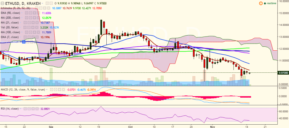 ETH/USD managed to close just above 10.00 levels on Monday, but it is currently trading at 9.97 levels at the time of writing (Kraken).