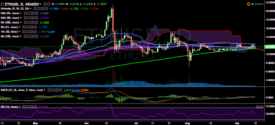 ETH/USD once again failed to break above 100-day MA and has declined after hitting 12.24 levels. Taking support at 90 EMA, the pair is currently trading at 11.84 levels (Kraken).