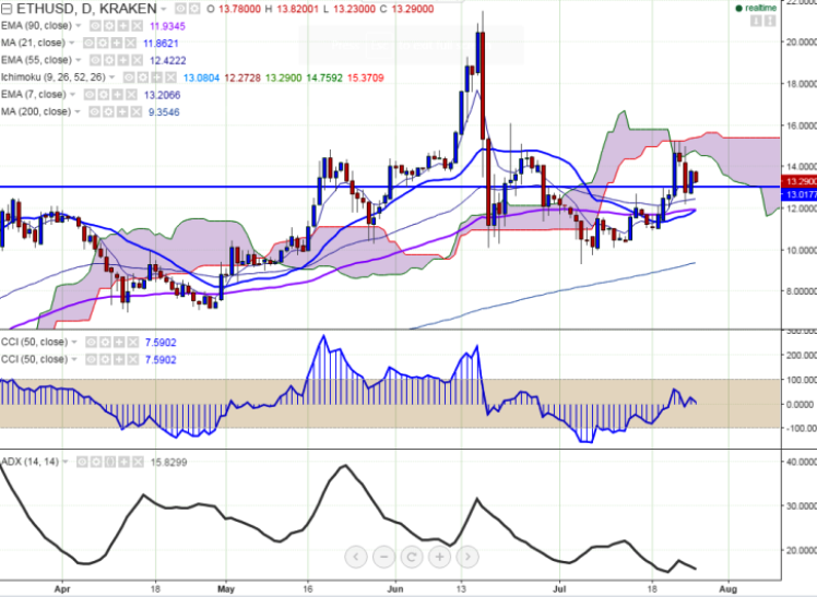 ETH/USD is seen trading in below in red on Tuesday. The pair has declined sharply after making a high of $13.82 (KRAKEN). It is currently trading around $13.36 at the time of writing.