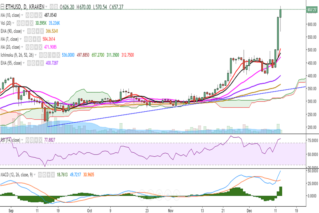 ETH/USD is trading higher on Wednesday as it soared past 600 levels. It is currently trading at 657 levels at the time of writing (Kraken).