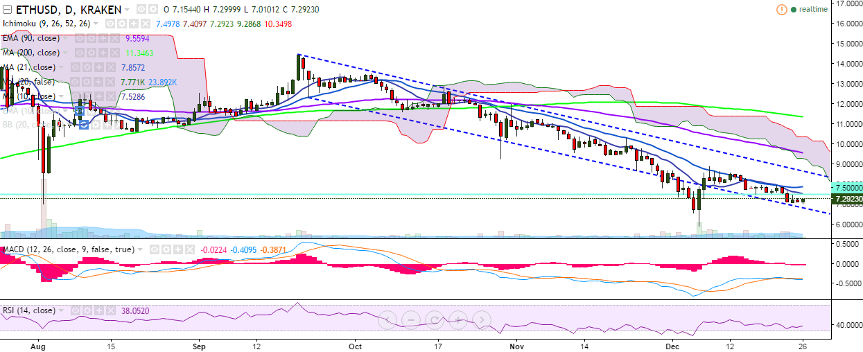 ETH/USD is trying to maintain strength above the 7.00 mark and is currently trading at 7.29 levels at press time (Kraken).