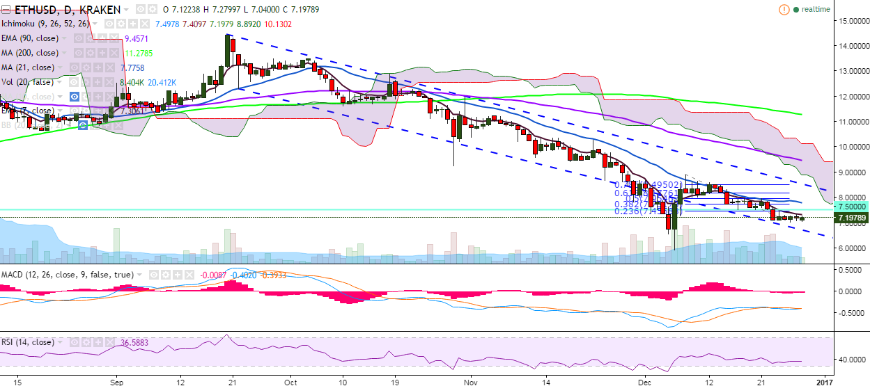ETH/USD is continuing its rangebound trade on Wednesday as well, with its upside capped by 7-EMA. It is currently trading at 7.19 levels (Kraken).