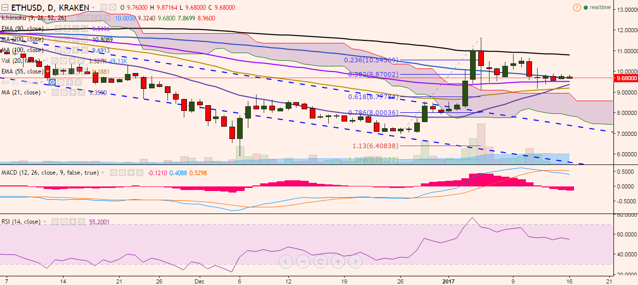 ETH/USD is trading in a narrow range between 9.65 and 9.90 levels, trying to hold its strength above 90-EMA. It is currently trading at 9.68 levels at press time (Kraken).