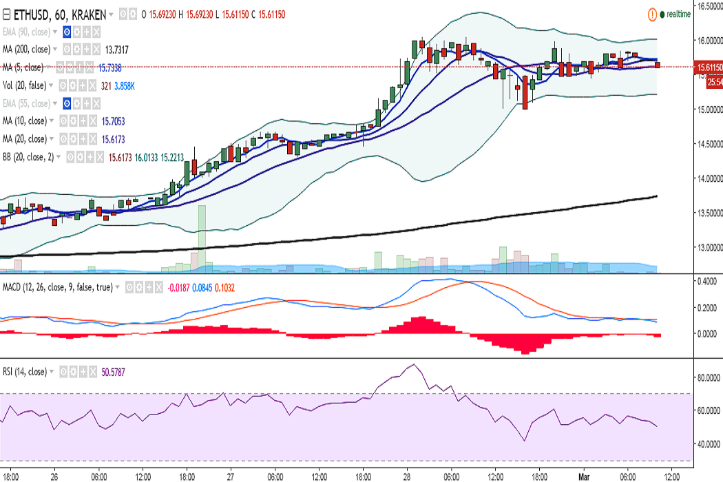 ETH/USD hit 16.06 levels on Tuesday, stopping just shy of 16.08 levels (22 June 2016 high) but failed to hold its strength and closed at 15.63 levels. It is currently trading at 15.73 levels at the time of writing (Kraken).