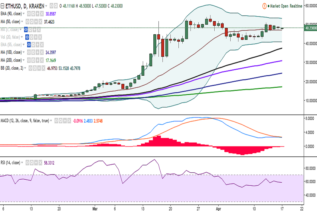 ETH/USD is trading in a narrow range as it struggles to close above the 50.00 mark. It is currently trading at 48.31 levels at the time of writing (Kraken).