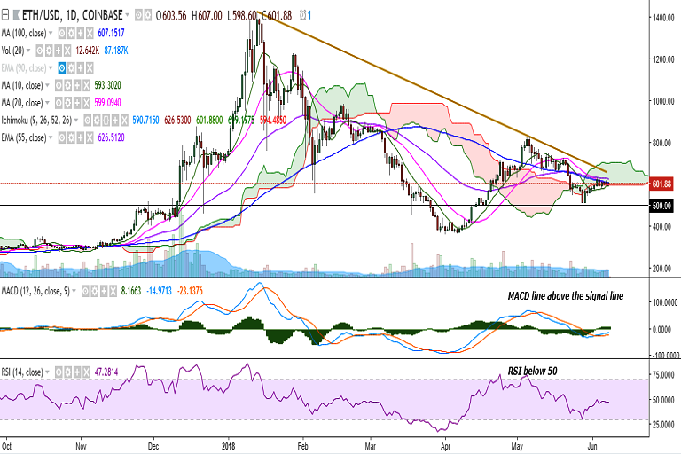 ETH/USD continues to consolidate in a narrow range inside the Ichimoku cloud and trading at 600 levels at the time of writing (Coinbase).