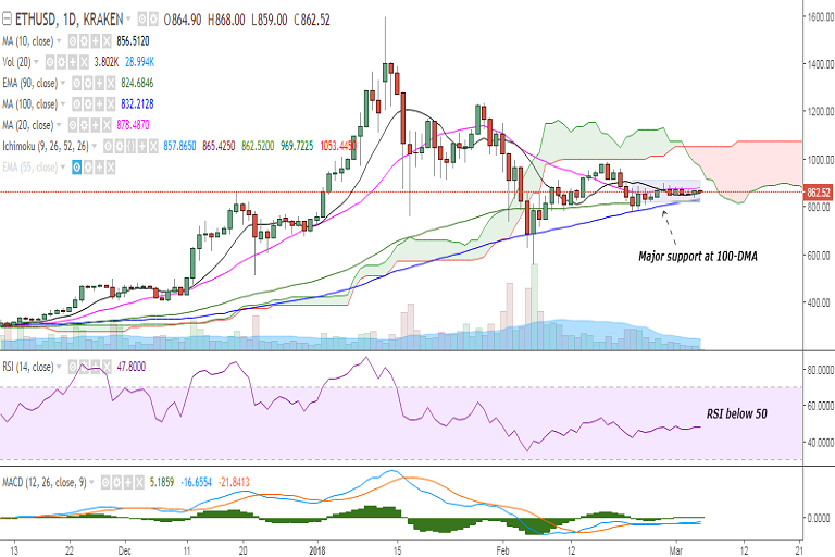 ETH/USD remains rangebound on Monday as its upside is capped by 20-DMA. It is currently trading at 862 levels at the time of writing (Kraken).