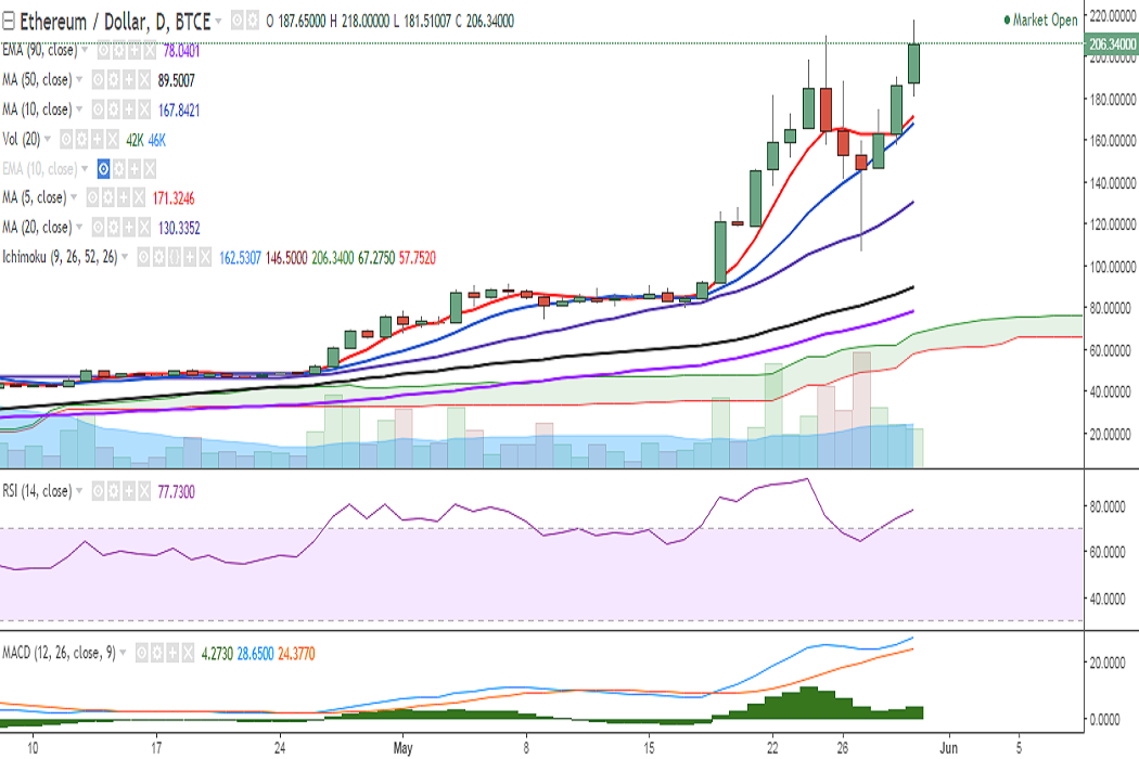 ETH/USD surpassed previous high of 210 levels on Tuesday and hit 218 levels. It is currently trading at 207 levels at the time of writing (BTC-e).