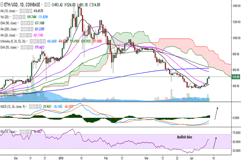 ETH/USD is trading higher and has broken above 500 levels. It is currently trading at 508 levels at the time of writing (Coinbase).