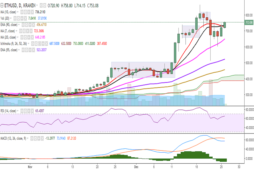 ETH/USD is trading higher on Tuesday and has broken above 10-DMA on Tuesday. It is currently trading at 754 levels at the time of writing (Kraken).