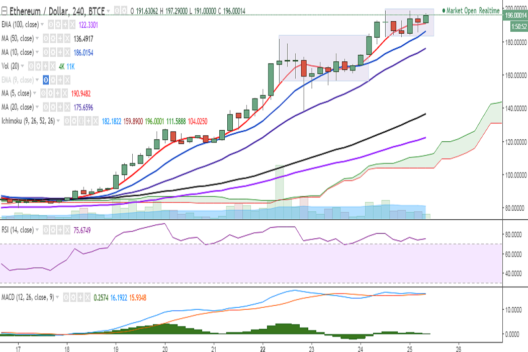 ETH/USD broke above 182 levels (161.8% extension of 40.12 and 128) and hit a fresh all-time high at 199 levels on Wednesday before closing at 185.50 levels. It is currently trading at 196 levels at the time of writing (BTC-e).