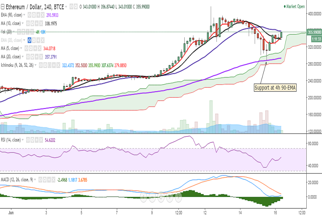 ETH/USD dropped to 288 levels on Thursday before it successfully closed above 10-DMA at 349 levels. It is currently trading at 355 levels at the time of writing (BTC-e).