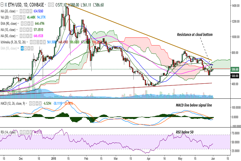 ETH/USD is trading just shy of Ichimoku cloud at 587 levels at the time of writing (Coinbase).