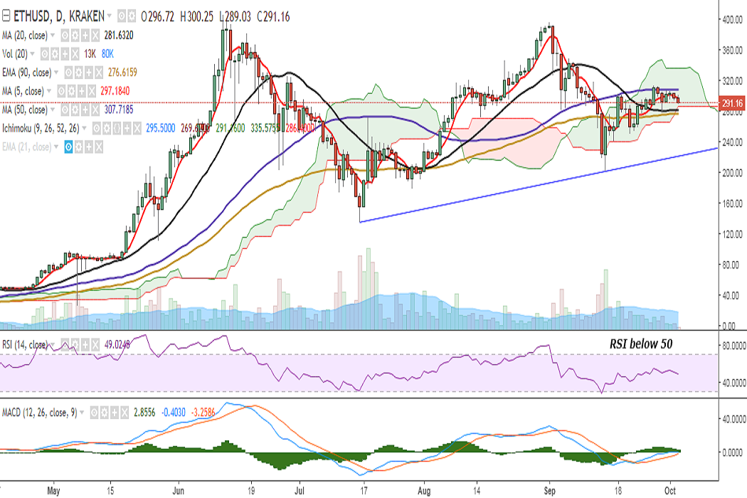 ETH/USD continues trading in the red on Tuesday as it failed to break above 50-DMA. It is currently trading at 291 levels at the time of writing (Kraken).