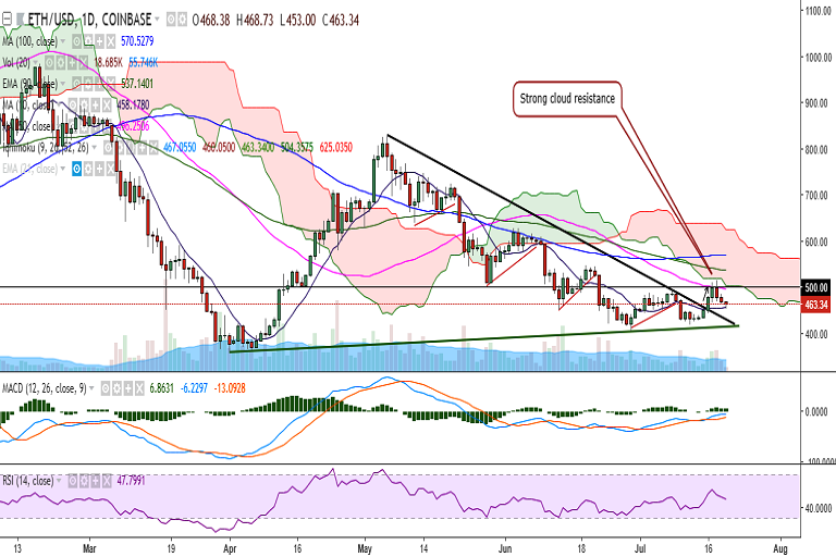 - On the upside, the pair faces stiff resistance at 496 (50-DMA) and a break above would test 504 (cloud bottom)/537 (90-EMA)/570 (100-DMA).