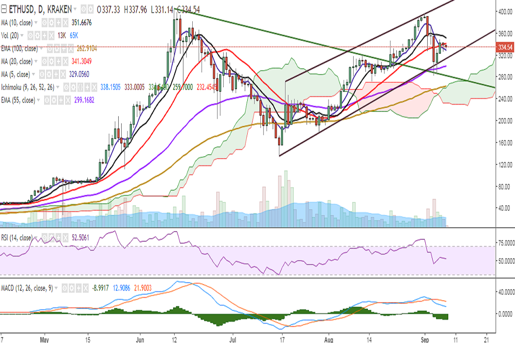 ETH/USD is trading in a very tight range on Friday as it struggles for a decisive break above 20-DMA. It is currently trading at 334 levels at the time of writing (Kraken).