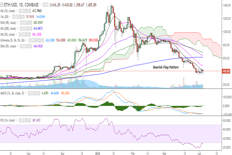 ETH/USD is trading in a narrow range on Wednesday as it struggles for a consistent break above 10-DMA. It is currently trading at 403 levels at the time of writing (Coinbase).